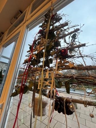 Besonders schön: Auch die Wohngruppen wurden festlich geschmückt. Dort entstanden kleine Inseln voller Adventsstimmung – mal mit Tannenzweigen, mal mit Engeln oder Weihnachtssternen. Manche Bewohner*innen beteiligten sich aktiv, andere schauten interessiert zu und gaben freundliche Hinweise wie: „Der Stern sieht unten besser aus“ oder „Das haben wir früher auch so gemacht.“