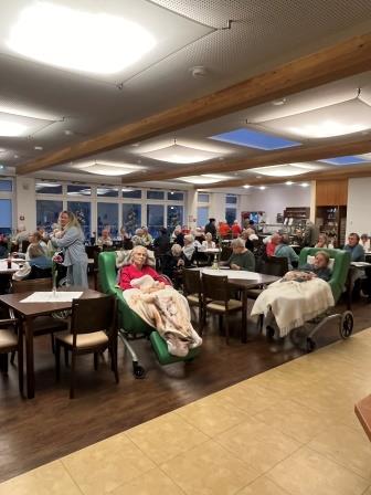 Schon nach den ersten Takten kamen unsere Bewohner*innen, Angehörigen und Mitarbeitenden in der Cafeteria zusammen – bereit für ein paar beschwingte Schritte oder ein ruhiges Beisammensein bei Kaffee und Kuchen. Der Raum war voller Lachen, Gesprächen und dem kleinen, feinen Chaos, das entsteht, wenn die Hüften für einen Walzer geschwungen werden und gleichzeitig der Kuchenteller noch auf dem Tisch steht.