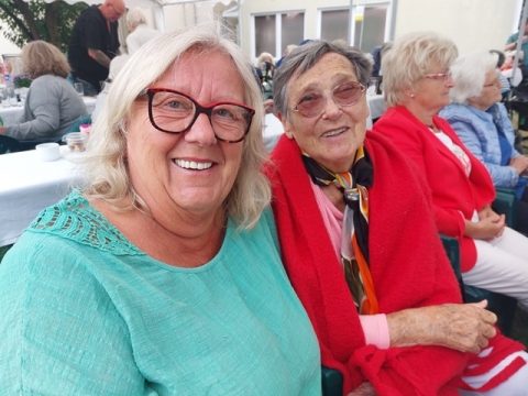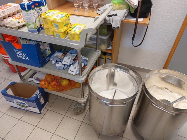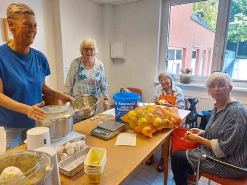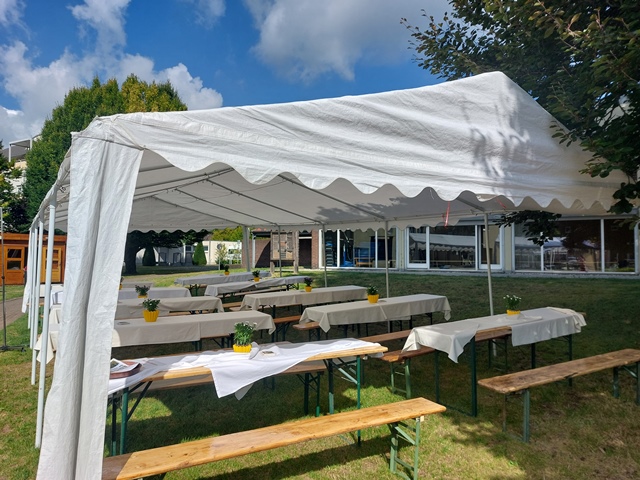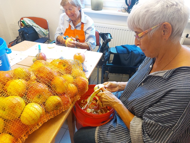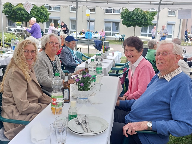 Rund 80 Angehörige und Gäste aus der Nachbarschaft sind unserer Einladung gefolgt und füllen unseren Garten und den Saal mit Leben, Lachen und Begegnung. Schon am Vormittag herrschte ein reges Treiben: Stühle wurden gerückt, Tische wurden aufgebaut, der Duft von frischem Apfelteig lag in der Luft – und hinter den Kulissen zeigte sich, wie viele helfende Hände notwendig sind, um ein solches Fest auf die Beine zu stellen. Parallel zu unseren Vorbereitungen trafen sich die Appeltatenmajestäten, die wie Engel angeflogen kamen, um ihren legendären Apfelteig für frische Waffeln zuzubereiten. Zwar nicht für unser Fest, wie von Frau Kitzhofer fälschlicherweise angenommen, sondern für das morgige Appeltaten-Event. So oder so - die Majestäten sind immer bei uns Willkommen und wir stellen gerne unsere Räumlichkeiten für das Ehrenamt zur Verfügung!